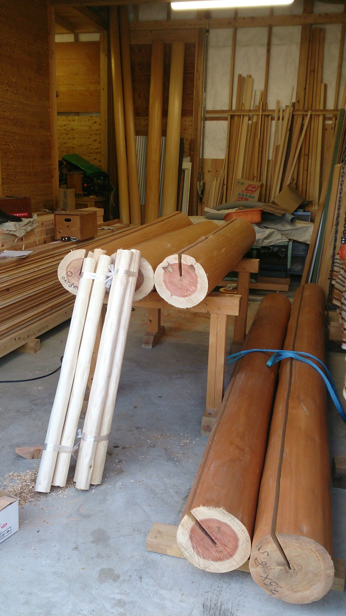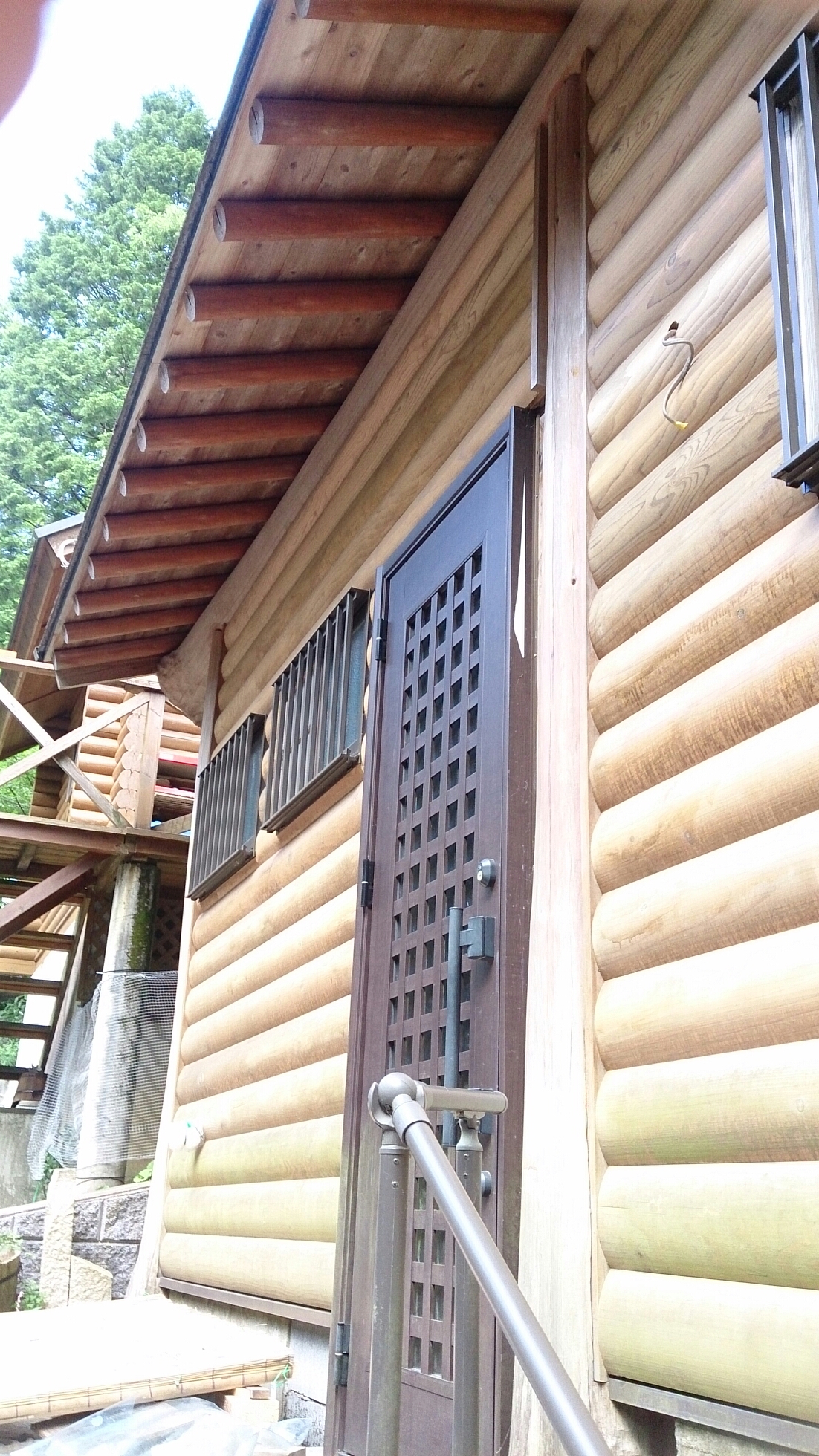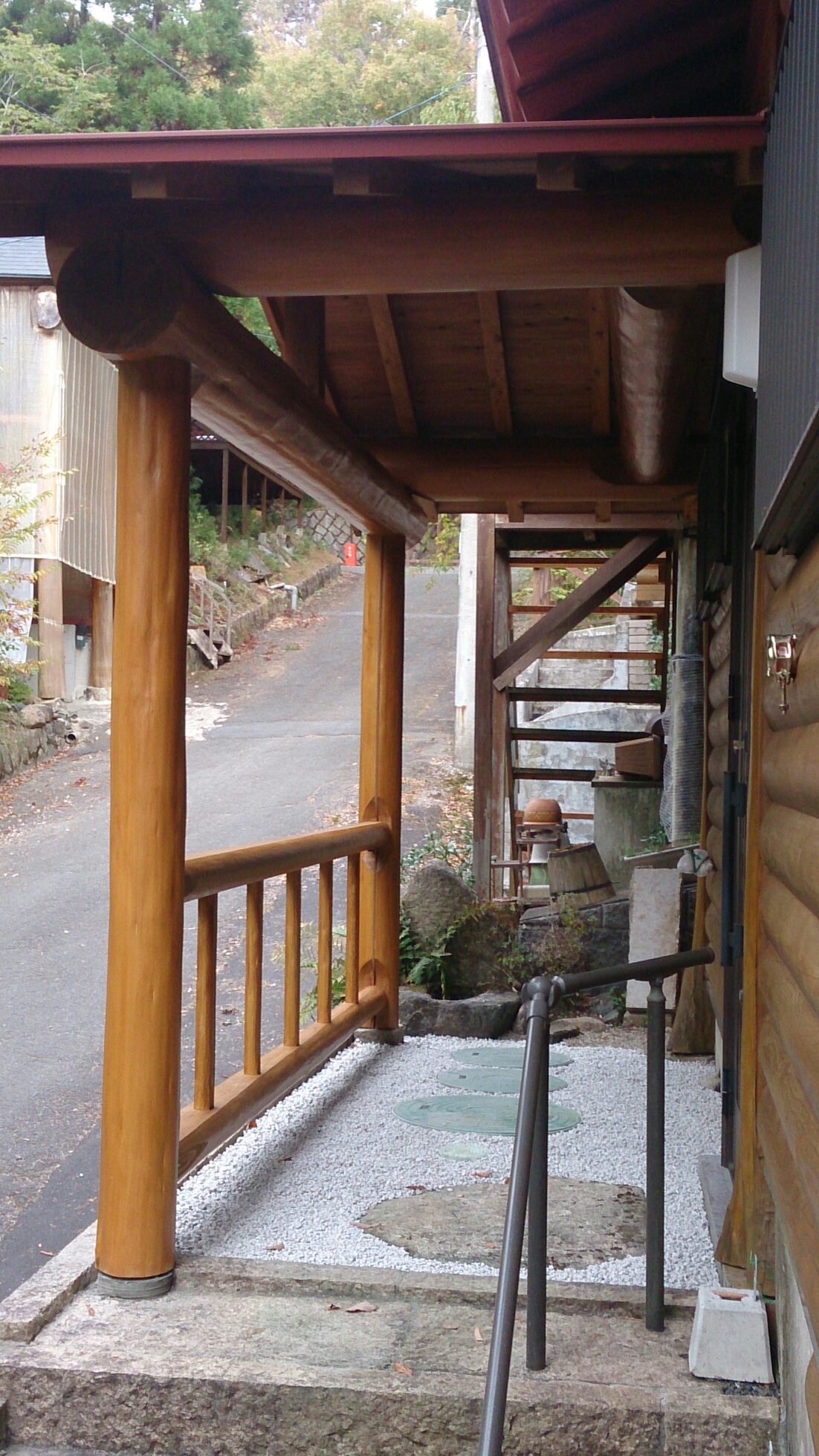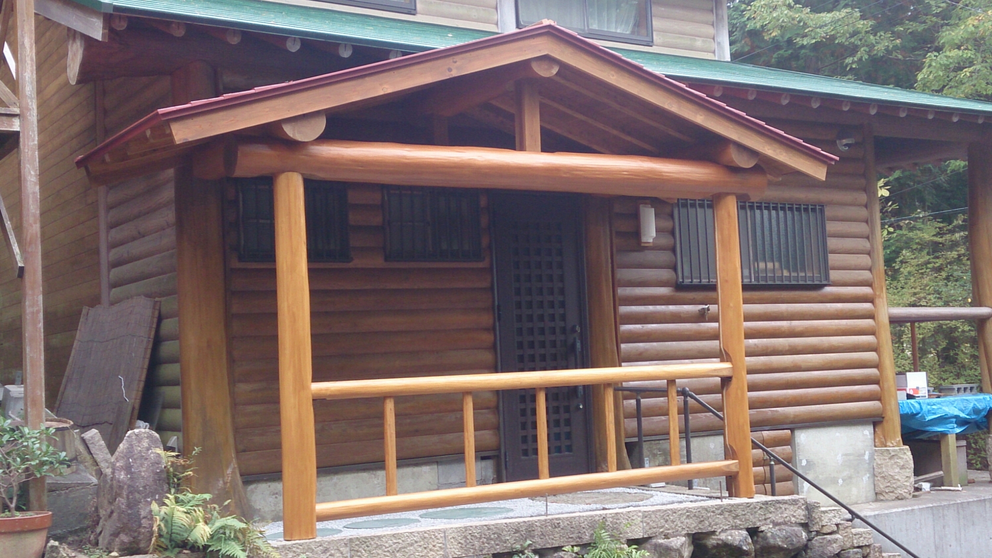 瑠璃溪K様邸玄関ポーチ増築工事 玄関ポーチが、樋も無く雨や雪で汚れる始末、かれこれ8年が過ぎるそうです 立派な建物のため、材木の選別に悩みました。やはり、北山杉磨き丸太ですね。加工も手間取りましたが、無事に完成しました。